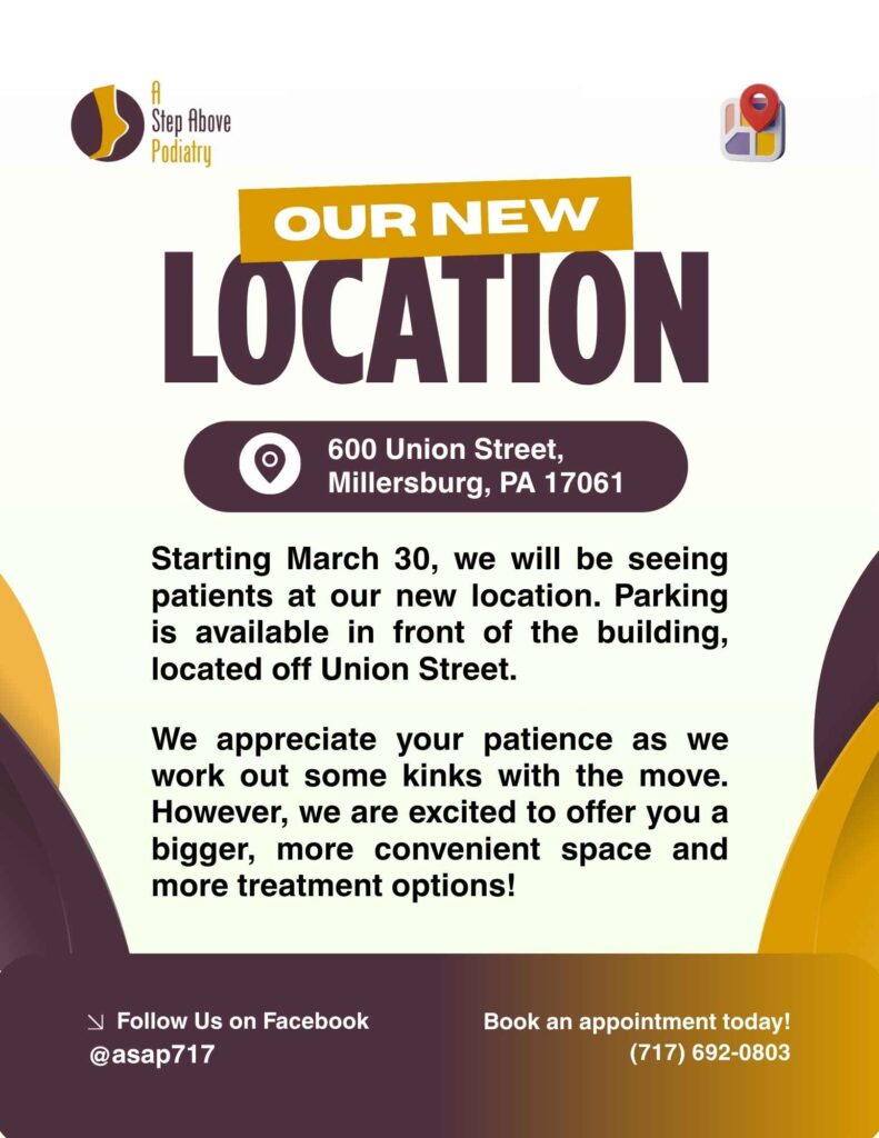 A Step Above Podiatry offers foot and ankle surgery, general podiatry, wound care, diabetic foot care, and bunion, ingrown toenail, and wart care in Camp Hill and Millersburg, PA.